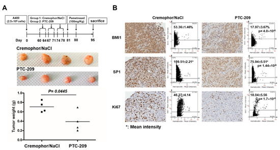 We finally examined the in vivo therapeutic potential of PTC-209 for the treatment of NSCLC tumors with pemetrexed resistance. The pemetrexed-resistant A400 NSCLC cells were subcutaneously inoculated into the back skin of NOD/SCID mice and divided into two groups when the tumor volume reached 50 mm3, with group 1 as the vehicle control and group 2 as the PTC-209-treated group, with 20 mg/kg for 5 days/week for a total of 3 weeks. After one week of the last PTC-209 treatment, all the mice received 100 mg/kg pemetrexed for two times with an interval of 7 days as outlined in our previous report [21]. The mice were then sacrificed at Day 7 after the last pemetrexed treatment and the tumor weight was measured. The weight of tumors was significantly lower in the PTC-209-pretreated group (Figure 7A). The percentage of tumor cells with BMI1 or Ki67, the marker for cell proliferation, and the mean staining intensity of SP1 expression was significantly reduced in the PTC-209-pretreated group (Figure 7B). These results suggest that PTC-209 is a potential combination agent for NSCLCs treatment when pemetrexed resistance has developed.