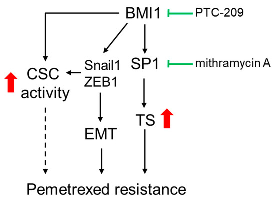 The proposed model for BMI1 involved pemetrexted resistance in NSCLC. The role of BMI1 in pemetrexed resistance could result from three ways including (1) the upregulation of SP1 followed by increased TS expression; (2) The enhancement of the EMT process by upregulating Snail1 or ZEB1 expression; (3) The elevation of CSC activity. Inhibition of BMI1 or SP1 activity by PTC-209 or mithramycin A may serve as the potential agents for overcoming the pemetrexed resistance in NSCLC patients.