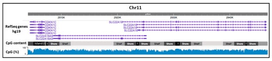 To explore the CpG density in the 11p15.5 chromosomic region, which carries the imprinted SLC22A18 and SLC22A18AS genes, we generated an epigenome map using the WashU Epigenome Browser (Figure 1). A high CpG rate was observed throughout the genomic sequence of both genes (>50%). We found five CpG islands in the chromosome region, one of which was located in the promoter region of the SLC22A18 gene and its antisense gene. CpG shores and CpG shelves flanked all the CpG islands, whose CpG density was progressively lower away from the CpG islands.