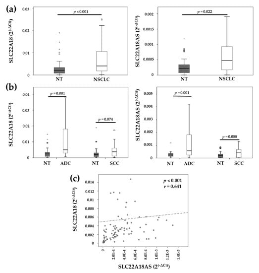 Expression levels of the SLC22A18 and SLC22A18AS genes in the tumor and matched nontumoral samples from patients with lung cancer. (a) Comparison of the SLC22A18 and SLC22A18AS gene expression levels in the NSCLC tissue. (b) Comparison of the expression levels of both genes according to histological subtypes. NSCLC: non-small cell lung cancer; ADC: adenocarcinoma; SCC: squamous cell carcinoma; NT: nontumor. Boxes show the interquartile range (IQR) and median (thick line); whiskers indicate the range. Outliers > 1.5 × IQR but < 3 × IQR from the nearest edge of the box are represented by open circles and those > 3 × IQR from the nearest edge of the box are represented by * symbols. (c) Spearman’s correlation of the SLC22A18 and SLC22A18AS expression levels.