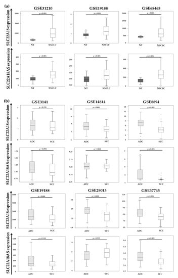 We expanded the expression analysis to eight different lung cancer datasets (GSE3141, GSE8894, GSE14814, GSE19188, GSE29013, GSE31210 GSE37745 and GSE68465) by obtaining the expression data for SLC22A18 and SLC22A18AS (Figure 3 and Figure S2). In datasets where both nontumor and tumor lung tissue expression data were available (GSE31210, GSE19188 and GSE68465), SLC22A18 and SLC22A18AS expression was analyzed, and overexpression of both genes was found in NSCLC tissues (p < 0.001) in all three of these datasets (Figure 3a). One of these datasets, GSE19188, also allowed us to compare the expression levels of SLC22A18 and SLC22A18AS for each histological NSCLC subtype (lung adenocarcinoma and SCC) independently with respect to the nontumor tissues. The results are similar to those previously observed for the second patient cohort analyzed, showing SLC22A18 and SLC22A18AS overexpression in lung adenocarcinoma (p < 0.001 for both genes) and SCC (p = 0.009 and p = 0.048, respectively) with respect to the nontumoral tissues.