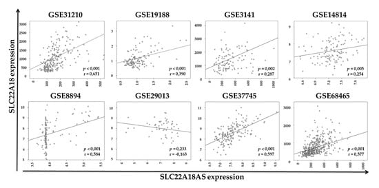 After confirming that NSCLC patients had aberrant expression of the SLC22A18 and SLC22A18AS genes, as identified through public databases, we investigated whether there was a genetic correlation between both genes, as observed in the second patient cohort. The Spearman’s correlation analysis showed a significant positive association for all except one of the consulted datasets (Figure 4).