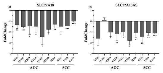 Effect of ademetionine supplementation on the expression of SLC22A18 and SLC22A18AS. Real-time PCR (qPCR) was conducted to quantify SLC22A18 (a) and SLC22A18AS (b) mRNA expression relative to Dimethyl Sulfoxide (DMSO)-treated controls at 24 h after ademetionine treatment (200 μM). ADC: adenocarcinoma; SCC: squamous cell carcinoma. *** p-value < 0.0001; ** p-value < 0.001; and * p-value < 0.05.
