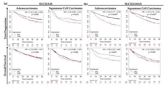 To evaluate whether SLC22A18 and SLC22A18AS expression levels were associated with clinical outcomes for patients with the main histological subtypes of NSCLC, we analyzed SLC22A18 and SLC22A18AS expression levels by first progression of disease and overall survival data using the KM Plotter website []. For lung adenocarcinoma patients, we found that a higher expression of SLC22A18 and SLC22A18AS was significantly associated with worsening disease progression (hazard ratio (HR) = 1.51, 95% confidence interval (CI) = 1.09–2.08, p = 0.011; and HR = 2.43, 95% CI = 1.77–3.34, p < 0.001, respectively). Then, low levels of SLC22A18AS were also associated with a better overall survival (HR = 1.95, 95% CI = 1.03–3.69, p = 0.037) (Figure 6a). However, we found nonsignificant differences for the SLC22A18 expression levels with respect to overall survival in the patients with lung adenocarcinoma. In the case of SCC, the trend was similar, and lower expression of both genes trended with a better clinical outcome. Nevertheless, these differences were significant only for the time to first disease progression (HR = 1.72, 95% CI = 1.33–2.23, p < 0.001) (Figure 6b).