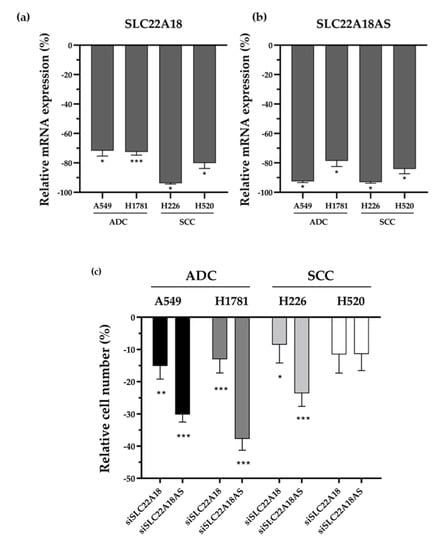SLC22A18 and SLC22A18AS knockdown inhibit cell proliferation. qPCR analysis of SLC22A18 (a) and SLC22A18AS (b) mRNA expression at 72 h post-transfection of each siRNA relativized to negative control (c) Relative cell proliferation assay in SLC22A18 and SLC22A18AS knockdown versus negative control after specific transfection. ADC: adenocarcinoma; SCC: squamous cell carcinoma. siSLC22A18: knockdown siRNA against SLC22A18; siSLC22A18AS: knockdown siRNA against SLC22A18AS. *** p-value < 0.0001; ** p-value < 0.001; and * p-value < 0.05.