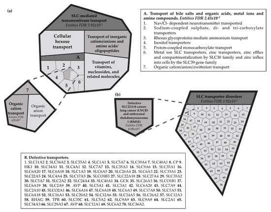 Representation of the enhanced reactome of the SLC22A18 gene. (a) Solute carrier (SLC)-mediated transmembrane transport. (b) SLC transporter disorder. SLC: solute-carrier superfamily.