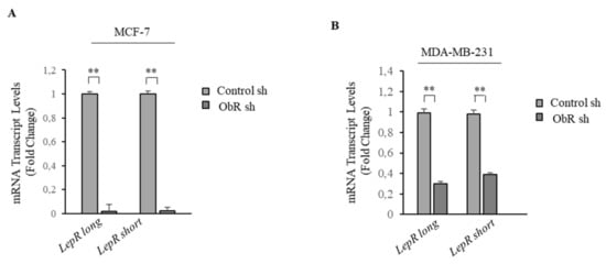 Expression of leptin receptor in ObR sh MCF-7 and MDA-MB-231 breast cancer cells. Real time RT-PCR assay for leptin receptor (long and short isoforms) mRNA expression in control sh and ObR sh MCF-7 (A) and MDA-MB-231 (B) breast cancer cells. The values represent the mean ± SD of three different experiments, each performed in triplicate. ** p < 0.005.