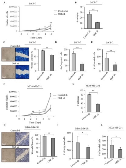 Effects of ObR knockdown on MCF-7 and MDA-MB-231 breast cancer cell phenotype. (A,F) Growth kinetics and (B,G) soft agar growth assays of Control sh and ObR sh MCF-7 and MDA-MB-231 breast cancer cells. (C,H) Wound healing, (D,I) Boyden chamber transmigration and (E,L) invasion assays in Control sh and ObR sh MCF-7 and MDA-MB-231 breast cancer cells. Pictures are representative of three independent experiments. The values represent the mean ± SD of three different experiments, each performed in triplicate. * p < 0.05, ** p < 0.005.