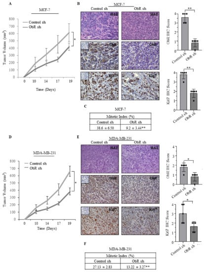 Furthermore, to evaluate the effects of ObR knockdown on tumorigenesis in vivo, both ObR sh and Control sh MCF-7 and MDA-MB-231 clones were injected into the mammary fat pad of female nude athymic mice and tumor growth was monitored. As shown in Figure 3A,D, a significant reduction in tumor growth of ObR sh clones compared to control ones was observed in both cell lines. These results fit well with a significant decrease in the expression of both Ki67, a well-known marker of cell proliferation (Figure 3B,E and Table 1), and mitotic index (Figure 3C,F) in MCF-7 and MDA-MB-231 ObR sh tumors compared with those revealed in tumors of Control sh mice.