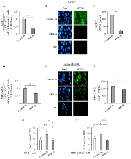 ObR knockdown effects on MCP-1 expression and monocyte recruitment. (A,D) Real-time RT-PCR assay for MCP-1/C-C Motif Chemokine Ligand 2 (MCP-1/CCL2) mRNA expression in Control sh and ObR sh MCF-7 and MDA-MB-231 breast cancer cells. (B,E) Immunofluorescent staining of MCP-1 protein expression in Control sh and ObR sh MCF-7 and MDA-MB-231 breast cancer cells. DAPI staining was used for nuclei detection (100× magnification). (C,F) Enzyme linked immunosorbent assay (ELISA) for MCP-1 protein secretion in Control sh and ObR sh MCF-7 and MDA-MB-231 breast cancer cells. (G,H) Trans-well migration of THP-1 in response to 5% charcoal stripped media (-) and the conditioned medium (CM) derived from Control sh and ObR sh MCF-7 and MDA-MB-231 breast cancer cells was assessed after 5 h incubation. The migrated monocytes were stained with DAPI and six random fields were captured per well with Olympus microscope at 10× magnification. The values represent the mean ± SD of three different experiments, each performed in triplicate. n.s., nonsignificant; * p < 0.05; **, p < 0.005.