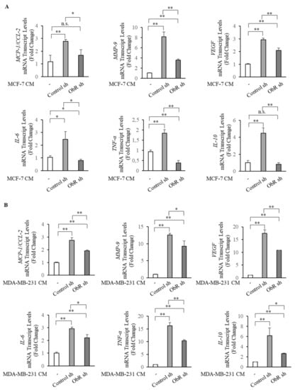 ObR knockdown in breast cancer cells affects the mRNA expression profile of tumor-associated macrophages (TAMs). THP-1 cells were stimulated with phorbol 12-myristate 13-acetate (PMA, 100 nM) for 14 h followed by 24 h rest to obtain THP-1 macrophage-like cells (M0). Real-time RT-PCR assay for MCP-1/C-C motif chemokine ligand 2 (MCP-1/CCL-2), matrix metalloproteinase-9 (MMP-9), tumor necrosis factor alpha (TNF-α), vascular endothelial growth factor (VEGF), interleukine-6 (IL-6), inteleukine-10 (IL-10) in M0 treated with 5% charcoal stripped media (-) or incubated with conditioned media (CM) derived from Control sh and ObR sh MCF-7 breast cancer cells for 5 days (A) and from MDA-MB-231 breast cancer cells for 3 days (B). The values represent the mean ±SD of three different experiments, each performed in triplicate. n.s., nonsignificant; * p < 0.05; ** p < 0.005.