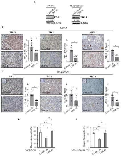 The PD-1/PD-L1 axis plays an important role in regulating phagocytosis, the process through which macrophages engulf tumor cells [39]. Thus, we evaluated the phagocytic activity in breast cancer TAMs. As shown in Figure 7D,E, CM-derived from Control sh clones significantly reduced phagocytic capacity of THP-1 macrophage-like cells (M0), while this down-regulation was no longer evident in macrophages treated with CM-derived from ObR sh clones.