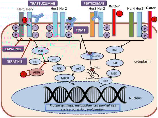 Another broad category in the different mechanisms of resistance includes elevations of other tyrosine kinase inhibitors. For example, studies have found that the cross-signaling between Insulin-like Growth factor-1 receptor (IGF-IR) and HER2 induces phosphorylation of HER2, and thereby activates signaling transduction [38]. Overexpression of c-met (tyrosine protein kinase met or hepatocyte growth factor receptor) has been found to confer resistance to trastuzumab [39].