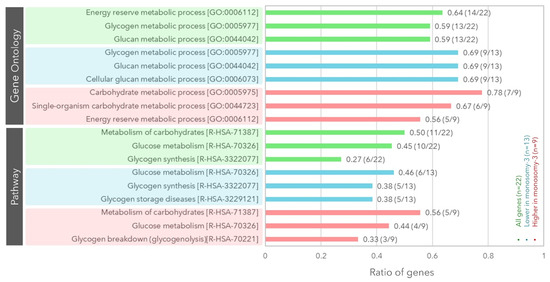 We initially identified n = 67 genes encoding proteins involved in glycogen synthesis or breakdown based on a literature and databank search using the platforms PubMed, Gene, OMIM, and UniProt (Table S1) [15,16,22,23,30,31,32,33,34,35,36,37,38,39,40,41,42,43,44,45,46,47,48,49,50,51,52,53]. We then calculated the median mRNA expression of these genes with regard to the monosomy-3 status with or without correction for the gene copy number. Using this approach, we could determine that n = 22 of the 67 genes (32.8%) exhibited a differential expression pattern in the monosomy-3 tumors regardless of the gene copy number (Table 1, Table S1). The unbiased gene set enrichment analysis demonstrated that these 22 genes were mainly associated with the Gene Ontology terms “energy reserve/glycogen/glucan metabolic processes.” Likewise, the major biological pathways involving these genes included the carbohydrate and glucose metabolism, as well as the glycogen synthesis (Figure 1).