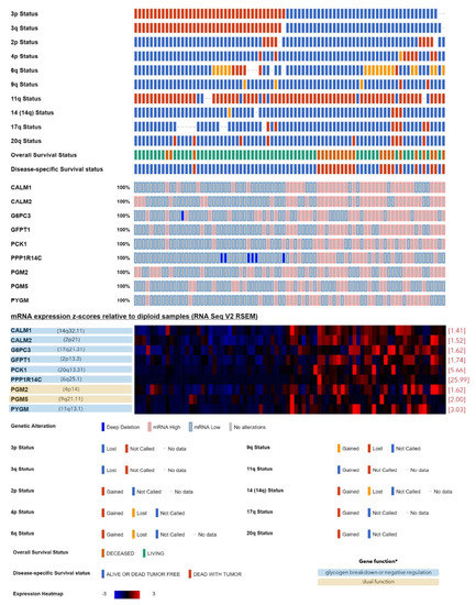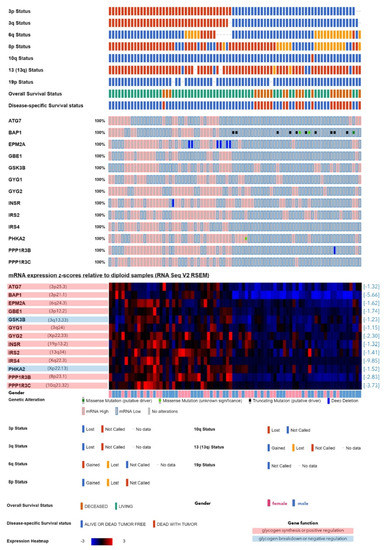 Genes involved in glycogen metabolism that exhibited a lower expression in the monosomy-3 tumors of the TCGA-UM cohort (n = 80 patients) regardless of the gene copy number. The tumor samples are represented by the columns, which were aligned according to the copy numbers of chromosome 3p and 3q (red: normal, blue: loss) in the uppermost two rows. Tumors with the loss of both 3p and 3q were defined as having monosomy-3, while this data was missing for n = 3 samples. The copy number of the chromosomes that harbor the remaining genes of interest, as well as the survival status are also presented in the upper rows, whereas the middle rows demonstrate the presence of genetic alterations. The expression heatmap in the lower rows was generated from the mRNA z-scores, with blue and red indicating mRNA levels that were up to three standard deviations lower or higher than the mean, respectively, whereas black denotes an expression at the mean. The loci of the analyzed genes are stated in parentheses next to the gene symbol in the heatmap. The fold changes are presented in square brackets on the right-hand side of the heatmap. Genes that function as positive versus negative regulators of glycogen synthesis are highlighted with a red or blue background, respectively. Patient gender is indicated underneath the heatmap.