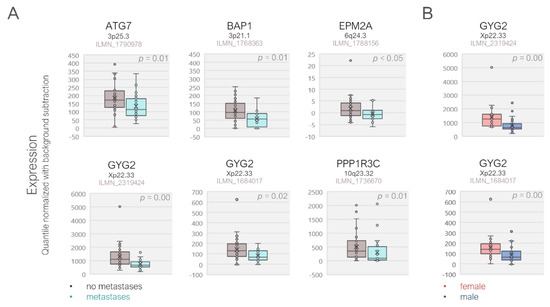 Differential gene expression in the validation cohort demonstrated by the scatter box plots. (A) The patients with metastases exhibited a significantly lower expression of the ATG7, BAP1, EPM2A, GYG2, and PPP1R3C genes. (B) GYG2 transcripts were also significantly lower in the tumors of the male versus female patients. p-Values were analyzed by the Mann–Whitney U test. The gene loci and the probe identifiers of the microarray are indicated underneath the gene symbols.