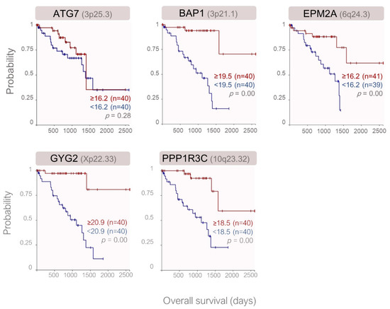 Of the 22 genes analyzed, n = 5 genes were expressed at significantly lower levels in the metastatic patients of the validation cohort and included ATG7, BAP1, EPM2A, GYG2, and PPP1R3C, which all function as the positive regulators of glycogen synthesis. GYG2 was the only gene that exhibited a gender-specific expression pattern, with the downregulation in the male patients. After Bonferroni correction, GYG2 remained as the only gene with a significantly lower expression in the metastatic or male patients (Figure 4, Table S4). Except for ATG7, the reduced expression of the remaining validated genes was associated with a lower overall survival rate in the TCGA cohort (Figure 5).