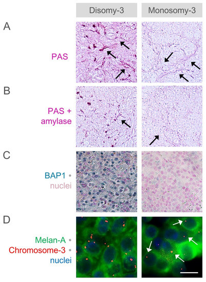 Estimated levels of amylase-sensitive glycogen with regard to the monosomy-3 status and nuclear BAP1 expression. The difference in the intensity of the periodic acid-Schiff (PAS) stainings (A) without and (B) with amylase pretreatment was taken as the amount of amylase-sensitive glycogen. The amylase pretreatment has also led to a weakening in the staining of the extracellular arcs (black arrows). Original magnification: 100×. (C) Expression of BAP1 was analyzed by immunohistochemistry and staining of the nuclei with nuclear fast red. Original magnification: 200×. (D) The copy number of chromosome-3 (red) together with the melanoma marker protein Melan-A (green) was determined by performing a combined immunostaining with fluorescent in situ hybridization (Immuno-FISH) on the paraffin sections. Nuclei were counterstained in blue with 4′,6-diamidino-2-phenylindole. Arrows indicate several cells with monosomy-3. Scale bar = 10 µm.