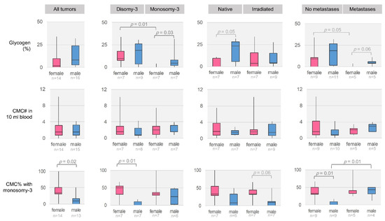 Remarkably, the further stratification of the female and male patients with regard to the monosomy-3 status, irradiation, or metastases revealed several gender-specific differences. For instance, the levels of glycogen were higher in the monosomy-3 tumors of male versus female patients (n = 7 patients each, p = 0.03, Figure 7, Figure S1). Glycogen was also more abundant in the non-irradiated tumors of male patients compared to females, but this effect failed to reach significance (n = 7 patients per group, p = 0.05). In contrast, the percentage of CMCs with monosomy-3 was lower in the male patients (n = 14 females, n = 13 males, p = 0.02). CMCs with monosomy-3 were detected at a similar extent in the female patients without or with metastases (Median: 33.3% for each group, n = 9 and 5 patients, respectively, p = 0.74). However, the male patients with metastases exhibited significantly more CMCs with monosomy-3 compared to the non-metastatic patients (Median: 43.8% vs. 0.0%, n = 9 and 4 patients, respectively, p = 0.01). Accordingly, the prevalence of CMCs with monosomy-3 was higher in the female versus male patients without metastases (median: 33.3% vs. 0.0%, n = 9 patients per group, p = 0.01, Figure 7). No remarkable difference was observed in the number of CMCs with regard to the patient gender. The median time until the development of metastases tended to be eight months shorter in the male versus female patients, but this effect remained below the level of significance (Median: 17.5 versus 25.5 months, respectively, p = 0.69, Mann–Whitney U test, n = 4 patients per group).