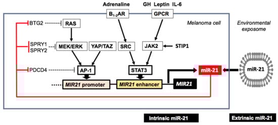 Proposed model showing endogenous and extrinsic miR-21 expression in malignant melanoma (MM). RAS-MEK-ERK-AP-1 signaling as well as signal transducer and activator of transcription 3 (STAT3) signaling increases intracellular miR-21 expression. Yes-associated protein (YAP) and its homolog transcriptional coactivator with PDZ-binding motif (TAZ) increases FOS transcription activating AP-1 composed of FOS and JUN. Endogenous signals such as adrenaline via β-adrenergic receptors (B1-2AR) and endocrine hormones such as growth hormone (GH), obesity-induced leptin and inflammation-associated interleukin 6 (IL-6) upregulate STAT3, the enhancer of MIR21. Cellular miR-21 levels may be further increased by extrinsic exosome-derived miR-21 derived from various components of the MM environment. MiR-21 via suppression of B-cell translocation gene 2 (BTG2), Sprouty 1 (SPRY1), Sprouty 2 (SPRY2) and programmed cell death 4 (PDCD4) potentiates oncogenic RAS-MEK-ERK-AP-1 signal transduction in MM.