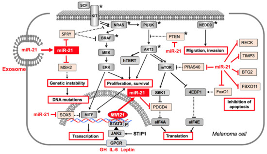 Cell signaling pathways that undergo oncogenic dysregulation in melanoma (MM). Somatic gene mutations in MM, which include KIT, NRAS, BRAF, MITF, PI3K, PTEN, AKT3, and NEDD9 (marked with asterisks), accelerate MM cell proliferation, survival, migration and invasion. In a similar manner, miR-21 promotes these oncogenic signaling pathways by downregulation of various tumor suppressors (SPRY, BTG2, PTEN, PDCD4) and inhibitors of mTORC1 and matrix metalloproteinases. MiR-21 inhibits apoptosis and cell cycle control via suppression of BTG2, FBXO11, and FoxO1. Via suppression of SOX5, miR-21 enhances the expression MITF. MiR-21 also attenuates MSH2 activity, thereby compromising DNA mismatch repair resulting in increased genetic instability. Cellular levels of miR-21 either increase by enhanced JAK2-STAT3 signaling or by exosomal transfer of miR-21 by cells of the MM microenvironment. Both somatic mutations in MM and epigenetic modifications of miR-21 have synergistical impacts on oncogenic signaling in MM.
