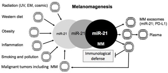 Starting from a trend-break in 1955, the incidence of malignant melanoma (MM) has increased steadily in Caucasian populations, which points to changes in lifestyle and environment [1,2,3,4]. To clarify the pathogenesis of MM, efforts have been focused on the identification of MM oncogenes, such as NRAS, BRAF, PTEN, MITF, NEDD9, hTERT and KIT, which have led to an improved understanding of MM etiology and opened new avenues for personalized treatment [5,6,7,8,9,10]. However, not only genetic deviations promote MM initiation, proliferation and progression but also epigenetic mechanisms including aberrant DNA- methylations and changes in microRNA (miR) expression, extensively reviewed elsewhere [11,12,13,14,15,16,17,18,19,20,21,22,23]. The present review focuses on miR-21, which is a key oncogenic miR overexpressed in MM, glioblastoma and other common cancers of Western societies [24,25,26,27]. MiR-21 is also increased in serum and plasma of MM patients and is regarded as a potential biomarker of MM [28,29,30]. This review highlights three major aspects: (1) The role of miR-21 signaling in MM pathogenesis and progression, (2) the impact of environmental factors enhancing miR-21 in MM and MM microenvironment with special attention to exosome-derived miR-21, and (3) potential therapeutic options that attenuate miR-21 signaling in MM. Translational evidence indicates that metabolic, environmental and lifestyle factors increase miR-21 expression including exosomal miR-21 trafficking involved in melanomagenesis and MM progression.