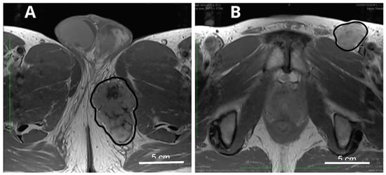 Epithelioid sarcoma—perineal area. (A) Locally advanced primary tumor (delineated, black contour); (B) Metastases to regional lymph nodes in the same patient (delineated, black contour).