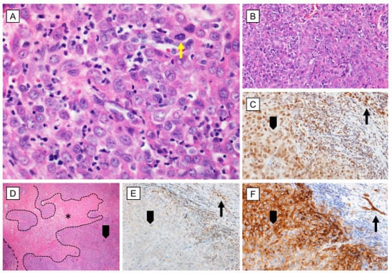 Epithelioid sarcoma—morphology and immune profile. (A), (B), (D) Epitheliod, large cells with abundant eosinophilic cytoplasm and moderate nuclear pleomorphism, mostly arranged in a solid sheath of neoplastic cells with marked geographical necrosis [hematoxylin-eosin 400×, 200× and 40× respectively]; (C) Positive strong nuclear reaction with FLI1 [200×]; (E) Immunohistochemical loss of INI–1 [200×]; (F) Positive strong reaction with CD34 [200×]; arrowhead—tumor cells; yellow arrow—mitotic figure; black arrow—internal control in endothelial cells; asterisk—necrosis.