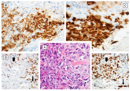 Epithelioid sarcoma—morphology and immune profile. (A) Epitheliod, large cells with abundant eosinophilic cytoplasm and moderate nuclear pleomorphism [HE, 200×]; (B) Positive strong reaction with CD34 [200×]; (C) Positive, focally strong reaction with cytokeratin AE1/AE3 (CKAE1/AE3) [200×]; (D) Immunohistochemical loss of integrase interactor 1 (INI1) [200×]; (E) Positive strong nuclear reaction with ERG [200×]; arrowhead—tumor cells; arrow—internal control in endothelial cells.