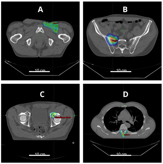 There are no data regarding the role of RT in recurrent or metastatic ES. Perioperative RT should be considered in recurrent ES if it was not applied for the primary tumor. In the case of in-field or near-field recurrence, reirradiation could be challenging. Local recurrence with limited volume in patients who previously received external beam RT may be managed with perioperative or definitive brachytherapy [87]. Larger recurrent ES may benefit from combined treatment, namely RT with chemotherapy or RT with hyperthermia. Sixteen patients treated with moderately hypofractionated RT and hyperthermia for radiation-induced thoracic sarcomas presented good local control and acceptable toxicity for such an approach [88]. Definitive radiotherapy could be applied in selected patients with oligometastatic ES (Figure 4B–D). There is a growing number of evidence that stereotactic body radiotherapy (SBRT) is beneficial in patients with oligometastatic sarcomas, providing local control around 90% [89,90]. Palliative RT should be considered in the case of symptomatic ES metastases.