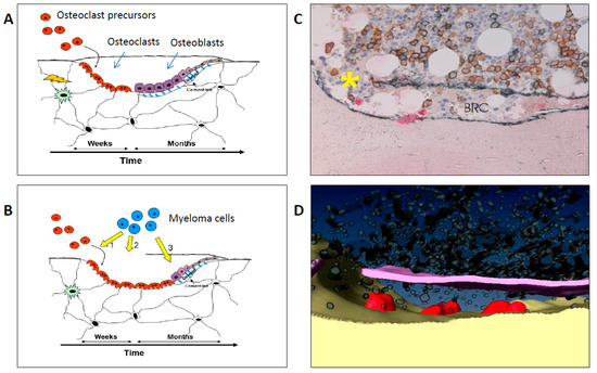 (A) Cartoon illustrating the normal bone remodeling taking place in bone remodeling compartments (BRC) that are separated from the bone marrow environment by a thin roofing canopy. (B) summarizes the major pathophysiological events in myeloma bone disease: (1) The multiple myeloma (MM) cells increase recruitment of osteoclast precursors, (2) MM cells infiltrate the BRC, disrupt the canopy and stimulate osteoclast activity, and (3) MM cells inhibit the osteoblasts, cause osteoblastopenia, and MM cell invasion into the BRC contributes to the uncoupling of osteoclast and osteoblast activity, (C) shows the microscopic findings where MM cells (brown) disrupt the canopy (yellow asterisk) and invade into the BRC. (D) A computerized reconstruction of canopy disruption and invasion of MM cells into the BRC. (C,D) are reproduced by permission from the original work published in British Journal of Haematology from 2010 [21].