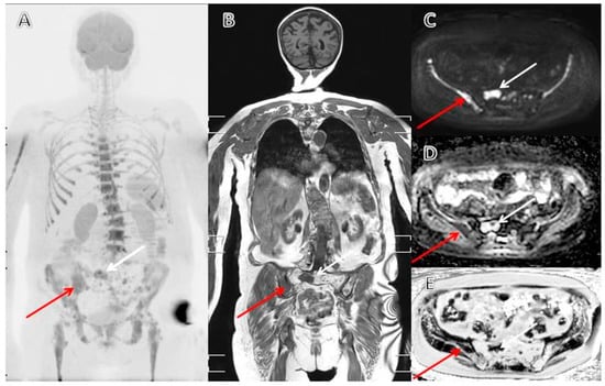 Whole body MRI of relapsing Myeloma, multiple new lesions primarily in right arm, spine, ribs and right side of pelvis. Many previously treated lesions in spine, pelvis and legs. Red arrow: typical new lesion with myeloma cells (low, homogenous ADC), White arrow: typical old lesion with cell free water content (high ADC) and possible focal recurrence. (A) MIP of DWI-sequence with high b-value, (B) T1-DIXON in-phase sequence, (C) DWI-sequence high b-value, (D) ADC (parametric map calculated from DWI), and (E) Fat fraction (parametric map calculated from T1-DIXON).
