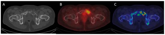 (A) CT of the pelvis showed a lytic lesion of the left pubic area. (B) 18F-FDG PET/CT demonstrated increased metabolism localized within the osteolytic lesion consistent with myeloma cells. (C) PET/CT with 18F-Sodium Fluoride (NaF) revealed increased patchy uptake in the periphery of the lytic lesion indicating areas bone remodeling activity.