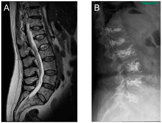 (A) MRI scan of multiple myeloma patient with several lesions of lumbar vertebrae and Th12. (B) Post-operative X-ray of the same patient after vertebroplasty in Th12 to L5 vertebrae. Bone cement leakage is visible related to L1.