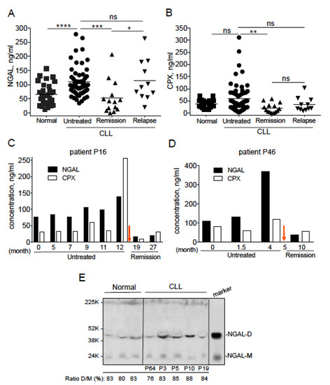 Serum concentrations of neutrophil gelatinase-associated lipocalin (NGAL) in healthy individuals and patients with CLL. ELISAs were performed on 30 normal individuals, 56 untreated CLL patients, 13 CLL patients in remission and 9 CLL relapsed patients. (A) NGAL (monomer and dimer), and (B) NGAL complexed (CPX) to matrix metalloproteinase-9 (proMMP-9) protein levels were determined. p values were calculated using a Mann–Whitney U-test; not significant (ns); * p < 0.05; ** p < 0.01; *** p < 0.001 and **** p < 0.0001. (C,D) Levels of NGAL and CPX in two CLL patients (P16 and P46) before treatment (FCR and BR, respectively) or at remission; the red arrow indicates the beginning of the treatment. (E) Representative Western blot of NGAL expression in sera of normal and CLL samples (remission P72; untreated P3, P5, P10 and P19); an acute myeloid leukemia (AML) cell lysate was used as a marker of NGAL dimer and monomer. The primary antibody used was anti-NGAL specific for the dimeric and monomeric forms (clone AF1757, goat IgG; R&D Systems). Data are expressed as the ratio (%) between dimer NGAL (NGAL-D) and monomer NGAL (NGAL-M) × 100.