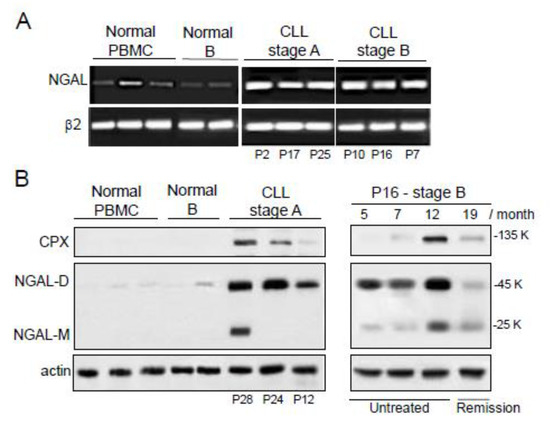 Expression profiles of NGAL in peripheral blood mononuclear cells (PBMCs) from healthy individuals, untreated CLL patients and patient P16 before FCR treatment or at remission. (A) Representative RT-PCR results for three PBMCs and two purified CD19+ B cells from healthy donors, and six CLL cells from untreated patients. (B) Representative Western blot (non-reducing conditions) results (left panel) for three PBMCs and two purified CD19+ B cells from healthy donors, and three CLL cell samples from untreated CLL patients (stage A). Western blot (non-reducing conditions) results (right panel) for CLL cells of patient P16 (stage B) before FCR treatment (months 5, 7, and 12) or at remission (month 19). The primary antibodies used were anti-NGAL specific for the dimeric and monomeric forms (R&D Systems) and anti-MMP-9 which recognizes CPX (Abcam).
