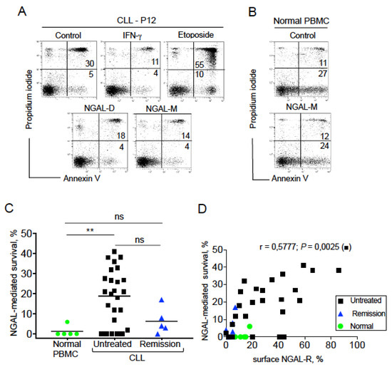 We next looked at whether NGAL influenced the balance between death and survival in CLL cells obtained from untreated patients. To this end, we used two commercially available recombinant human NGAL proteins: a dimer (hereafter referred to as NGAL-D) and a monomer NGAL (hereafter referred to as NGAL-M) (Figure S2). Firstly, we assessed the effects of the two NGALs (100 nM, for 24 h) on the viability of NGAL-R+ CLL cells. Etoposide (1 μM) was used as a positive control for CLL cell death [26], and recombinant interferon (IFN)-γ (1000 U/mL) was used as a positive control for CLL cell survival [27]. As expected, etoposide treatment resulted in a high level of cell death (i.e., annexin V+ cells; Figure 5A). In contrast, the proportion of annexin V+ cells was lower after treatment with NGAL-D, NGAL-M or IFN-γ than in control (untreated) experiments (Figure 5A). As shown in Figure 5B, PBMCs from healthy subjects (i.e., cells that express low levels of NGAL-R) were not affected by the addition of 100 nM NGAL. The NGAL proteins had a dose-dependent effect on the survival of CLL cells [28], and a dose of 100 nM NGAL was investigated in all subsequent experiments. In CLL cells from untreated patients, NGAL induced cell survival in 19 of the 25 CLL samples tested (Figure 5C), and this protective effect appeared independent of the Binet stage (stage A (n = 15) vs. stage B/C (n = 4), p = 0.883). In contrast, NGAL did not affect the viability of PBMCs from healthy subjects (Figure 5C). The survival rates were lower (albeit not significantly) in the remission group than in the untreated group (p = 0.086). We found a positive correlation between the NGAL-R expression and NGAL-mediated CLL cell survival for the untreated group (p = 0.0025). Hence, these data indicate that NGAL protects CLL cells from death, and that NGAL’s survival-promoting effect is specific for NGAL-R+ CLL cells.