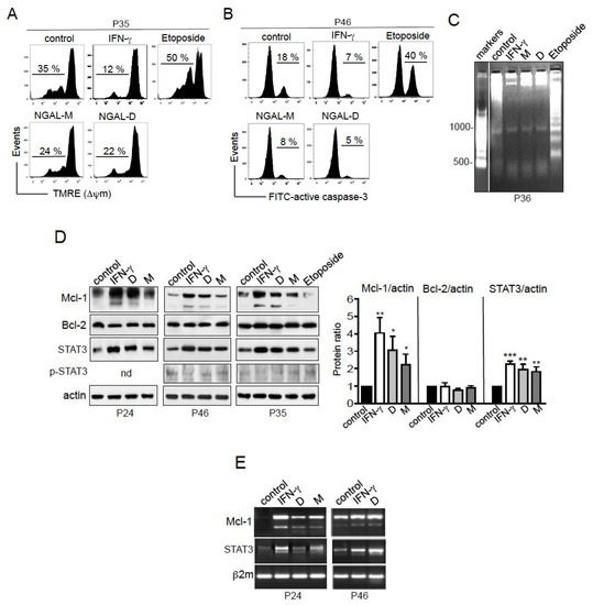 In further experiments, we investigated the molecular mechanisms underlying NGAL’s ability to protect CLL cells from cell death. The mitochondrial (intrinsic) pathway controls the balance between apoptosis and survival in CLL cells [29,30]. Etoposide activates the intrinsic apoptotic pathway, with the disruption of mitochondrial transmembrane potential (ΔΨm), caspase activation, and DNA fragmentation [31,32]. In contrast, IFN-γ protects CLL cells from apoptotic death [27]. Here, the exposure of cells to NGAL (D or M; 100 nM) or IFN-γ (1000 U/mL) for 24 h prevented ΔΨm loss (Figure 6A). As expected, etoposide (1 μM) treatment resulted in the increased dissipation of the ΔΨm (Figure 6A). Furthermore, we assessed the level of expression of active caspase-3 involved in mitochondrial apoptosis [33]. In contrast to etoposide’s triggering of caspase-3 activation, CLL cells treated with NGAL or IFN-γ displayed lower levels of active caspase-3 than untreated cells (Figure 6B). Nuclear DNA fragmentation (which is mediated by caspase-activated DNAse [31]) was observed in etoposide-treated CLL cells (Figure 6C). In contrast, DNA fragmentation was lower in NGAL- and IFN-γ-treated CLL cells than in untreated cells (Figure 6C). These data collectively indicate that NGAL dimers and monomers prevent spontaneous apoptosis in cultured CLL cells.