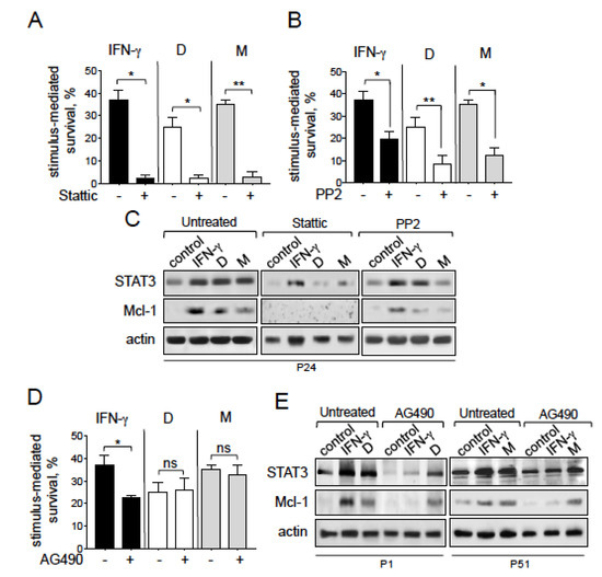 We next investigated whether the STAT3/Mcl-1 pathway was involved in the NGAL-mediated survival of CLL cells. In general, STAT3 can be activated by cytoplasmic tyrosine kinases, including the JAK2 and Src kinases [35,37,38,39]. In CLL, the JAK2/STAT3 pathway is constitutively activated and its inhibition leads to CLL cell death [40]. To this end, we treated cells with the following pharmacological inhibitors: Stattic, a selective STAT3 activation inhibitor that blocks the phosphorylation of STAT3 (on tyr-705) and therefore prevents it from binding to upstream kinases [41]; PP2, a selective Src family kinase inhibitor [42] and AG490, a selective JAK2 inhibitor [43]. For each pharmacological inhibitor, we applied the highest concentration that did not markedly affect the viability of CLL cells (i.e., a cell death rate of no more than 20%, relative to basal levels). As shown in Figure 7A, treatment with Stattic (5 μM) almost totally inhibited the survival of CLL cells mediated by NGAL (D and M) or IFN-γ. This inhibition was associated with the concomitant downregulation of STAT3 and Mcl-1 proteins (Figure 7C), indicating that the STAT3/Mcl-1 pathway was involved in the survival of CLL cells mediated by NGAL or IFN-γ. Furthermore, NGAL-mediated CLL cell survival was significantly prevented by PP2 (10 μM) (Figure 7B) but not by AG490 (10 μM) (Figure 7D); accordingly, the relative levels of STAT3 and Mcl-1 proteins were downregulated in the presence of PP2 (Figure 7C) but remained almost unchanged in the presence of AG490 (Figure 7E). As expected, AG490 markedly blocked IFN-γ-mediated CLL cell survival (Figure 7D) by downregulating the protein levels of STAT3 and Mcl-1 (Figure 7E). Taken as a whole, these results indicate that NGAL-mediated CLL cell survival is dependent on the Src/STAT3/Mcl-1 pathway.
