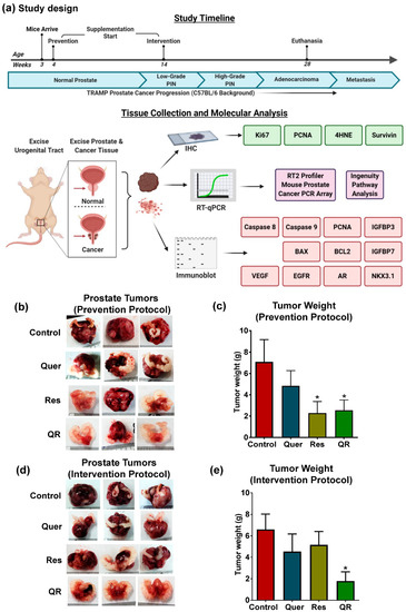 Dietary supplementation of grape antioxidants quercetin and resveratrol inhibit tumor development and progression in Transgenic Adenocarcinoma of Mouse Prostate (TRAMP) model. (a) Preclinical study design and the timeline for prevention and intervention settings in TRAMP mice. (b) Representative images of tumors with scale bar showing the size of tumors at the termination of study in prevention setting. (c) Graphical representation of tumor wet weight data in prevention setting. (d) Representative images of tumors with scale bars in the intervention setting. (e) Tumor wet weight data in the intervention setting. The tumor data are represented as mean ± SEM of 12 animals per group. GraphPad Prism 5 Software was used to perform statistical analyses on tumor data using one-way analysis of variance (ANOVA) followed by uncorrected Fisher’s Least Significant Difference (LSD) test (* p < 0.05).