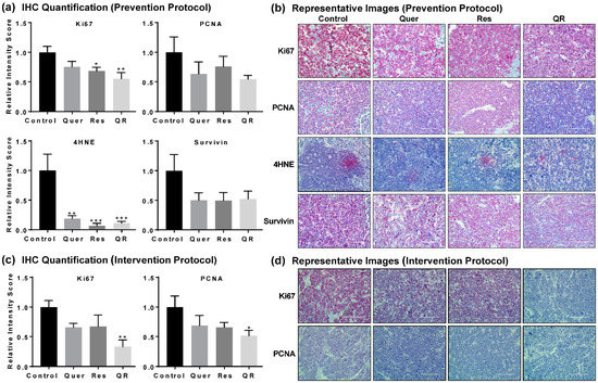 Next, we performed immunohistochemical (IHC) analysis of key proteins (Ki67, proliferating cell nuclear antigen (PCNA), 4-hydroxynonenal (4HNE), and Survivin) in prostate tumors to give potential insight to the molecular mechanisms of quercetin and resveratrol. Ki67 and PCNA are biomarkers of cell proliferation, rapid growth and cellular division. 4HNE is a biomarker of oxidative stress as it is produced during the degradation of lipids in cell membranes by free radicals. Survivin is a biomarker of cell survival as it prevents programmed cell death. IHC images were semi-quantified as described elsewhere [32]. We found significant decreases in 4HNE in all three treatment groups, suggesting anti-PCa effects of quercetin and/or resveratrol may arise by reducing the oxidative damage caused by 4HNE in PCa. We also found a marked decrease in cell proliferation markers Ki67 and PCNA, and cell survival marker Survivin in response to quercetin and/or resveratrol in the prevention setting (Figure 2a,b). Interestingly, the effects were more apparent in the quercetin–resveratrol group for Ki67 and PCNA, suggesting an additive effect of combination at the molecular level. This was further supported by our data in intervention settings, where the quercetin–resveratrol group showed a significant decrease in Ki67 and PCNA (Figure 2c,d).