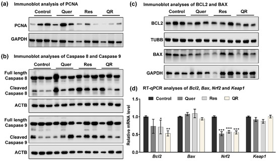 Quercetin–resveratrol supplementation induces apoptosis in prostate tumors. (a) Immunoblot analysis of PCNA protein. GAPDH was used as a loading control. (b) Immunoblot analyses of full length and cleaved caspases-8 and -9 proteins in TRAMP tumor tissues. β-actin (ACTB) was used as a loading control. (c) Immunoblot analyses of BCL2 and BAX proteins. β-tubulin (TUBB) and GAPDH were used as loading controls. (d) RT-qPCR analyses of Bcl2, Bax, Nrf2, and Keap1 mRNA levels in TRAMP tumor tissues. Data are represented as mean ± SEM. A one-way ANOVA with Tukey’s multiple comparison test was performed (* p < 0.05, ** p < 0.01, *** p < 0.001).