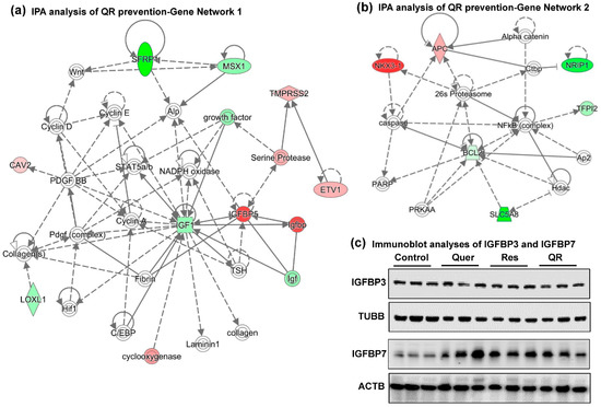 Gene networks analysis of quercetin–resveratrol modulated genes suggest IGF1 and BCL2 as key signaling nodes associated with anti-PCa effects. Differentially expressed genes from PCa PCR array with cut-off criteria of ≥2-fold change in any one treatment group with statistically significant change (p < 0.05), and ≥ 1.5-fold change in any other group (total 22 genes) were uploaded in Ingenuity Pathway Analysis (IPA) software. (a) Gene network 1 indicating IGF1 inhibition as a key player interacting with most of the genes in the network. (b) Gene network 2 indicating BCL2 inhibition as another important player interacting with most of the genes in the network. Red indicates upregulated genes, green indicates downregulated genes, and uncolored nodes indicate genes not included in the PCR array but appeared during IPA analysis to connect the genes of the network. Solid lines indicate robust interactions, whereas dashed lines are significant but less frequent. (c) Immunoblot analyses of IGFBP3 and IGFBP7 proteins. TUBB and ACTB were used as a loading control.