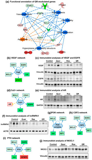 Analysis of quercetin–resveratrol (QR)-modulated genes suggest cumulative antitumor actions and upstream inhibition of major PCa signaling pathways. (a) Functional annotation showing cumulative actions of QR-modulated genes: increased apoptosis and inhibition of cell viability/ proliferation, hyperplasia, vasculogenesis, and angiogenesis. (b,d,g–i) Using IPA, upstream regulator analysis identified genes potentially involved in changes seen in RT-qPCR analyses. Genes from array are in red (upregulated) and green (downregulated), while predicted functions and upstream regulator genes and interaction lines are in orange (activation) and blue (inhibition). Lines in yellow indicate findings inconsistent with the state of downstream molecules. The gray dotted line shows unpredicted effects. Immunoblot analyses of (c) vascular endothelial growth factor (VEGF) and epidermal growth factor receptor (EGFR), (e) androgen receptor (AR), (f) hnRNPA1, and (j) NKX3.1 proteins. Vinculin, ACTB, and GAPDH were used as loading controls.