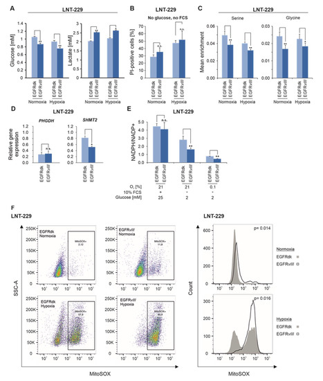 EGFRvIII enhances glucose consumption and lactate production under starvation conditions. (A) Cells were incubated in glucose restricted (2 mM glucose) serum-free medium under normoxic or hypoxic (0.1% oxygen) conditions. Glucose and lactate concentration were determined in the supernatant (n = 3, mean ± S.D., * p < 0.05, ** p < 0.01). (B) LNT-229 EGFRdk and EGFRvIII cells were exposed to glucose- and serum-free medium under normoxic or hypoxic (0.1% oxygen) conditions. Cell death was quantified by propidium iodide staining (n = 3, mean ± S.D., n.s. = not significant). (C) Cells were exposed to glucose restricted (2 mM D-Glucose-13C6) serum-free medium under normoxic conditions or 0.1% oxygen. Analysis of amino acid isotopologues was performed by HPLC-ESI-MS/MS (n = 3, mean ± S.D., * p < 0.05, ** p < 0.01). (D) cDNA of cells was generated and gene expression of PHGDH and SHMT2 was analyzed by qPCR. Values are normalized to 18S as well as SDHA housekeeping gene expression (n = 3, mean ± S.D., n.s. = not significant, * p < 0.05). (E), Cells were incubated as indicated. Analysis of NADPH/NADP+ ratios was performed by a luminescence-based assay (n = 3, mean ± S.D., n.s. = not significant, ** p < 0.01). (F), Cells were incubated in serum-free medium with glucose deprivation (2 mM glucose) in normoxia (21% oxygen) or in combination with hypoxia (0.1% oxygen). Analysis of MitoSOX-positive cells was performed by FACS analysis (n = 3). The MitoSOX signal of EGFRdk vs. EGFRvIII cells is plotted as a function of sideward scatter (SSC-A) (left panel) or cell number (right panel).