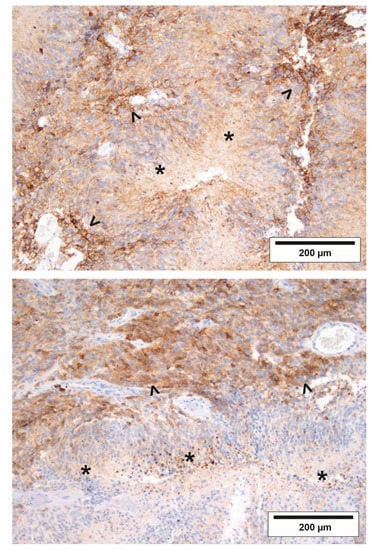 EGFRvIII immunohistochemistry of two exemplary GBs. Formalin-fixed, paraffin-embedded tissue of two GBs was analyzed by immunohistochemistry with antibodies for EGFRvIII. Asterisks (*) indicate necrosis in GB tissue, arrowheads (>) highlight EGFRvIII-positive tumor cells distant from nutrient and oxygen deprived perinecrotic regions.