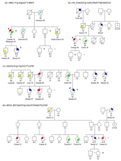 Figure 1. Segregation of BRIP1, RAD51D and ATM pathogenic mutations. (a) Family with c.484C>T (p.Arg162*) BRIP1 mutation, (b) Family with c.94_95delGT (p.Val32Phefs*38) RAD51D mutation, (c) Family with c.3663G>A (p.Trp1221*) ATM variant; (d) Family with c.8934_8935delTG (p.Glu2979Alafs*9) variant in ATM. Index cases are indicated by an arrow. Confirmed mutation carriers are indicated by a “+” sign and non-carriers by a “−” sign. Age at diagnosis and cancer type is specified when known. Ov (ovarian), Mel (melanoma), Gas (gastric), Thy (thyroid), Liv (liver), Lung (lung), Br (breast), H&N (head and neck), Col (colon), Cvx (cervix) and CUP (unknown primary tumour).