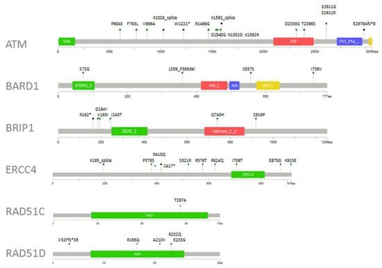 DNA repair defects prompt genetic instability, a well-known carcinogenic trigger. Therefore, functional defects in any DNA repair gene can contribute to the accumulation of errors and, ultimately, to cellular transformation. In fact, most HBOC susceptibility genes encode proteins which are involved in DNA repair. Mutations in these genes compromise the effectiveness of DNA repair, leading to genomic instability. Reciprocally, the accumulation of these mutations would be promoted by genomic instability, and this mutagenic environment would eventually enhance tumour progression. Proteins, such as ATM, BARD1, and Fanconi Anemia (FA) BRIP1, ERCC4, PALB2, RAD51C and RAD51D proteins, are involved in DNA repair pathways and have previously been linked to HBOC susceptibility associated with low to moderate risks [5,6].