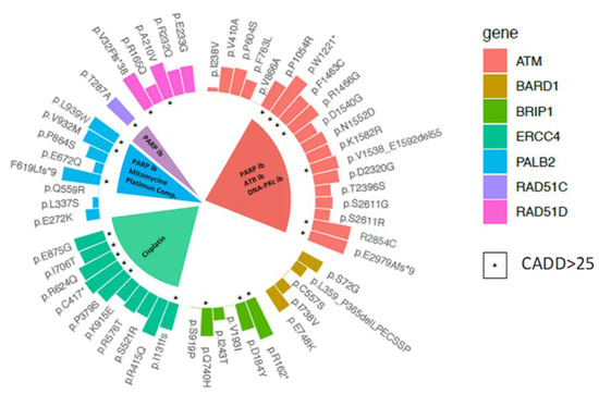 Figure 3. Circular barplot showing the distribution of CADD scores for different variants per gene. Variants with CADD score > 25 are indicated by “*”. Apart from the loss of function protein variants, other rare missense mutations were prioritised according to CADD-score. For ATM, p.Pro1054Arg, p.Phe1463Cys, p.Arg1466Gly and p.Arg2654Cys; for BRIP1, p.Asp184Tyr and p.Gln740His; for ERCC4 p.Pro379Ser, p.Arg624Gln, p.Ile706Thr and p.Glu875Gly; for PALB2 p.Val932Met and p.Lys939Trp; for RAD51C p.Thr287Ala; for RAD51D p.Ala210Val. Different drugs for which a response is predicted for some variants with a CADD score >25 in several genes are indicated in the inner part of the circular barplot. “ib” inhibitors.