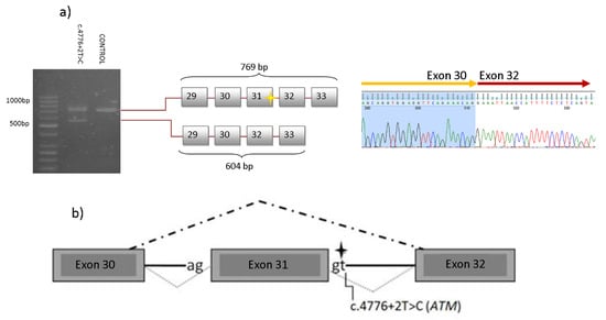 Figure 4. Characterization of the c.4776+2T>C variant of ATM. (a) PCR products were separated by a 2% agarose gel electrophoresis. The c.4776+2T>C variant caused the skipping of exon 31, resulting in a product which is 165 nucleotides shorter than the full-length product (769 nucleotides). (b) Schematic representation of the exon skipping caused by c.4776+2T>C ATM variant.